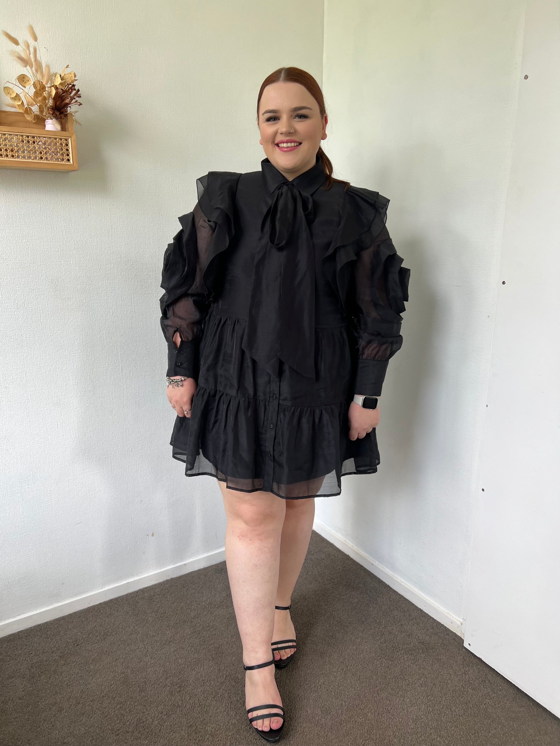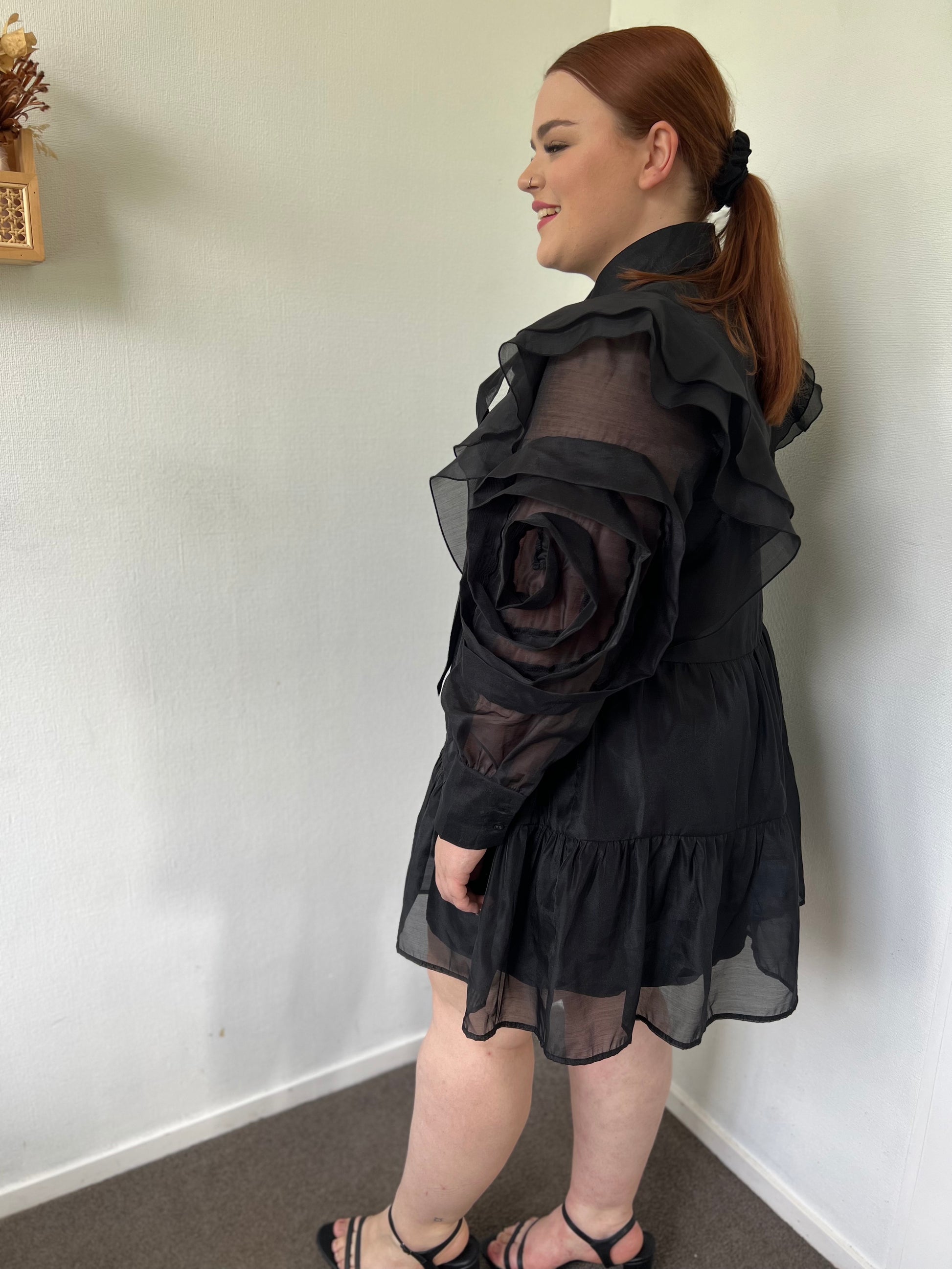 Relaxed fit mini dress. Long sleeves with rose and ruffle details. Collared neckline with tie. Button through front closure. Fully lined. Sheer fabrication.